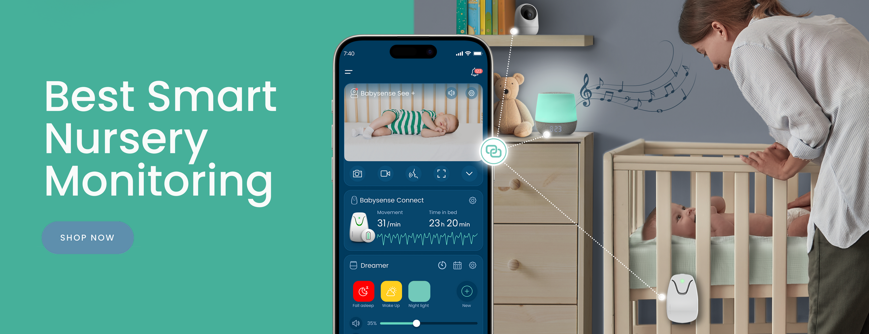 One app lets you monitor your baby, track sleep along with breathing motion, plus play soothing sounds and light for a cozy environment—all while keeping you connected and in control through instant updates, no matter where you are.