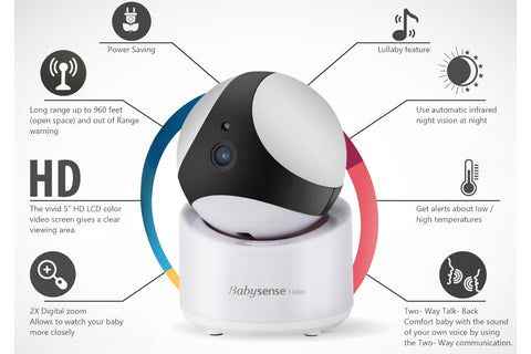 18.“And the temp reading in the room makes sure the baby is warm or cool enough and you can turn on a lullaby to soothe them back to sleep, so they don’t see mom or dad thus making it that much harder to go back to sleep.” - Chris D.19.“Love the color and sturdiness of the product. The inside is easy to clean, which is always appreciated! Although it's a baby product, I could see many other uses throughout the house and may purchase one for me! Priced right, too.” - Julie W.20.“Like the other reviews have stated, Babysense has amazing customer service! I am now a loyal customer because of it.” - Ashley M.21.“The monitor goes everywhere in the house with me. Also, baby sense has impeccable customer service. They are kind, timely with reply’s, and easy to make contact with. Love, love, love this brand all around!” - Mindy A.22.“This has amazing night vision and telescoping so you can see anywhere in their room. And you can scan at night so you will be able to hear kids in either room. I also love that you can add more cameras. The company seems super helpful as well!” - Leslie S.23.“So far it is the best! The picture quality is clear, the battery life of the parent unit is great and I love that I can have a camera in each kid’s room. The cameras also do a remote full range tilt and swivel.” - Kristine M.