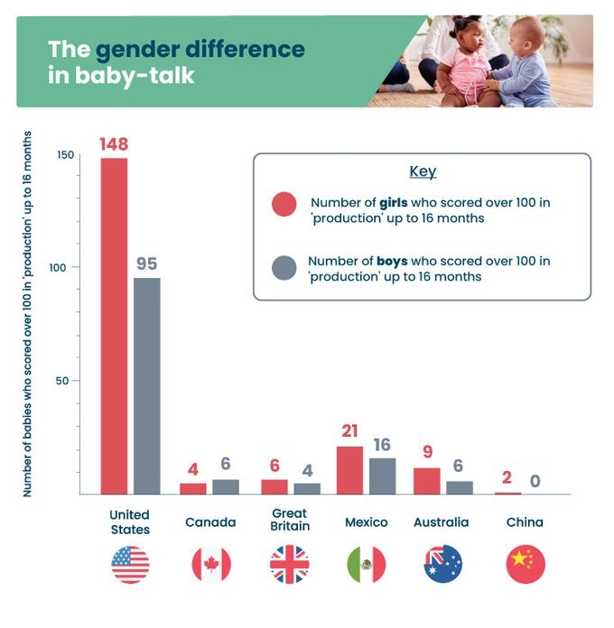 In the United States, it’s more common for baby girls to pick up words than for boys.Around 60% more American girls than boys scored over 100 for word production!