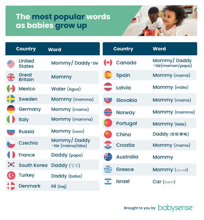 On the other hand, some seem to prefer dad over mom, as in seven countries the most popular first word is ‘daddy’. In all of these seven countries, the next most popular word said by babies is ‘mommy’.