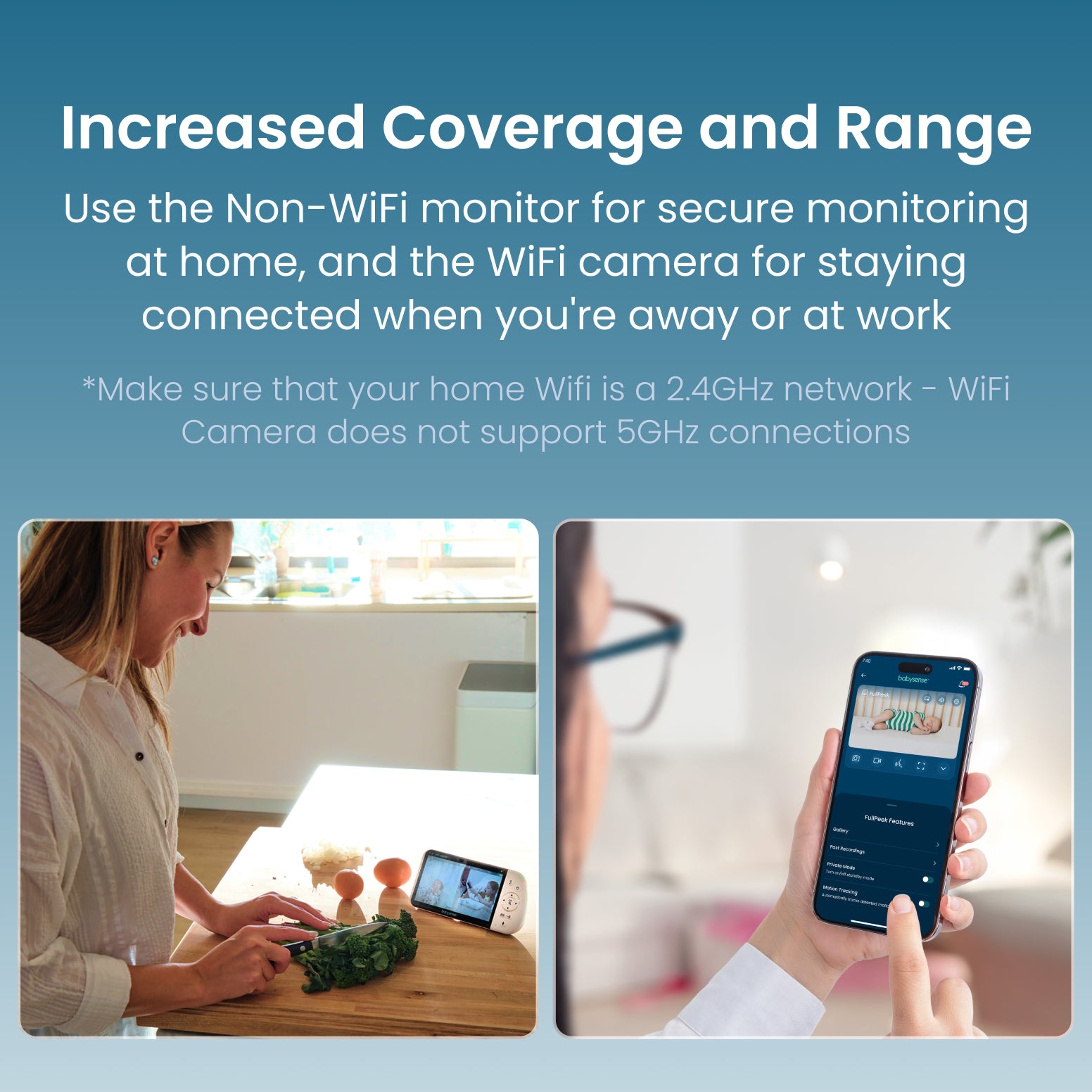 Use the Non-WiFi monitor to watch your sleeping baby and the WiFi camera to keep an eye on your toddler monitor both independently for complete peace of mind.