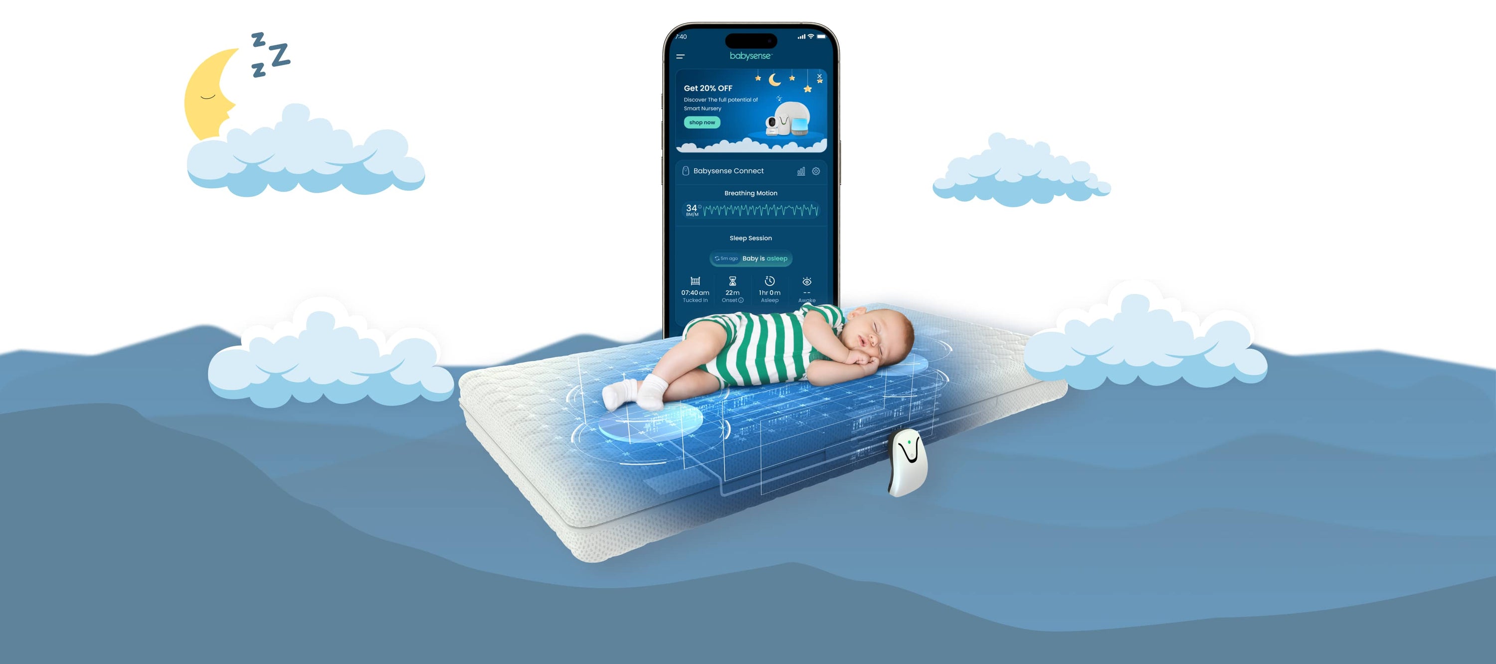 The Babysense Connect Sleep Monitoring Solution tracks your baby’s breathing motion without wearables, offering automatic sleep monitoring and in-depth sleep analytics. Through the Babysense app, you can monitor your baby’s sleep patterns, helping you optimize their rest while simplifying parenting.